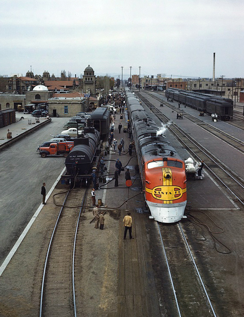 It’s March of 1943, and Jack Delano has ventured westward to visit the Atchison, Topeka and Santa Fe Railway. And here he has captured their streamliner, the “Super Chief”, being serviced at the depot in Albuquerque, New Mexico. Servicing these diesel streamliners with a large crew takes merely five minutes.