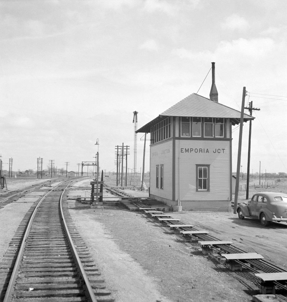 We’re heading back east now, with California far behind in the distance . . . indeed, we’re well into Kansas. Our Santa Fe train is passing by the AT&SF’s Emporia Junction tower located a bit east of the yard in Emporia, Kansas. The track crossing our main belongs to the Missouri-Kansas-Texas Railway (the Katy). This photograph is taken just inside of a wye, of which the northern extension is the start of the line up to Topeka. If one looks closely, the east leg of the wye can be barely discerned just past the signal bridge. The date is March of 1943.