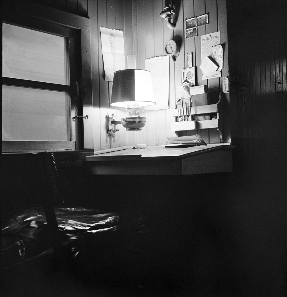 The scene is inside an Indiana Harbor Belt caboose, featuring the conductor’s work desk. It’s a splendid study of the workspace that’s used by the boss of the train. There are the usual railroad supplied appurtenances such as the oil lamp, the rack that holds rule books, timetables and other paperwork, and the wall mounted gauge which displays the train line air pressure. Then there are the personal touches such as the pin-up photos, a thermometer, a couple cartoons, and even some photographs of (perhaps) the conductor’s pet dog. Note the pencil holder tacked to the book rack, and the blackout applied to part of the lamp shade. I wish we could tilt up the desk surface to reveal what is stored in its compartment. It’s one of those photos that begs to be studied, and doing so reveals a wealth of interesting detail.