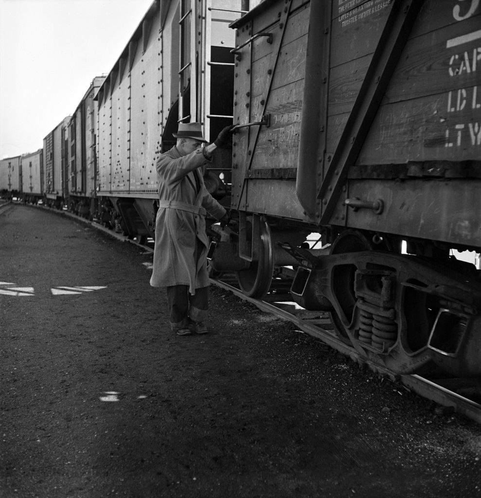 Jack Delano spied this switchman working the crest of the hump in the Illinois Central yard at Chicago, Illinois. It’s a cold day in November of 1942, and the worker is prepared for the day. Don’t let his Fedora fool you into thinking this is management on the hump . . . a look below the overcoat reveals a working man’s dungarees and work shoes. He is preparing to pull the coupler pin on the car just as it crests the hump, allowing for it’s gravity-assisted journey down into the yard beyond.