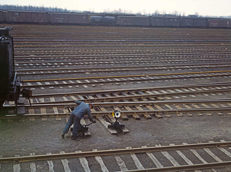 Jack Delano had visited the Chicago and North Western’s Proviso Yard earlier in the winter of 1942-43 before his journey out West. But he’s back and busy documenting railroaders at work in C&NW’s huge yard near Chicago. It’s April of 1943, the snow is gone, but there is still a chill in the air. A switchman is seen lining a switch in the never-ending task of sorting freight cars.