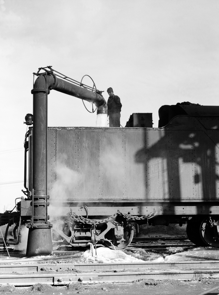 This Chicago and North Western locomotive is having its thirst quenched as the fireman fills its water tank. We’re at the coaling tower in the Proviso yard near Chicago on a cold day in December of 1942. The tender has been filled with coal, and the locomotive’s sand dome is full. This stop at the water penstock completes the fuel and water replenishment. Next comes a thorough greasing of the valve gear and other moving parts, and she’ll be ready for the days labor.