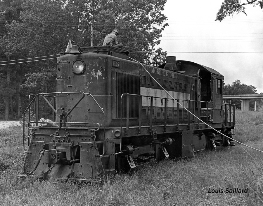 Looking through Ron Findley’s collection, I came across a few photo prints of three of the ALCO model RS1 locomotives that the Louisiana Midland Railway owned during its final life. Shown below is the #1107, a former Gulf, Mobile and Ohio locomotive of the same number. It appears that a crew member is adding water to the unit’s radiator via the top filler during its servicing routine. The photographer noted that the engine had overheated while pulling 54 cars.