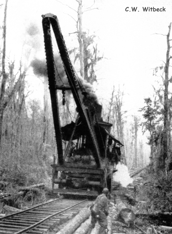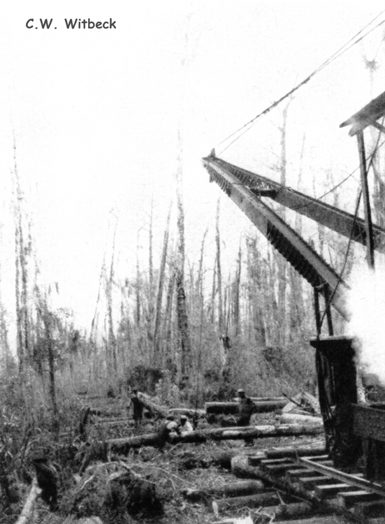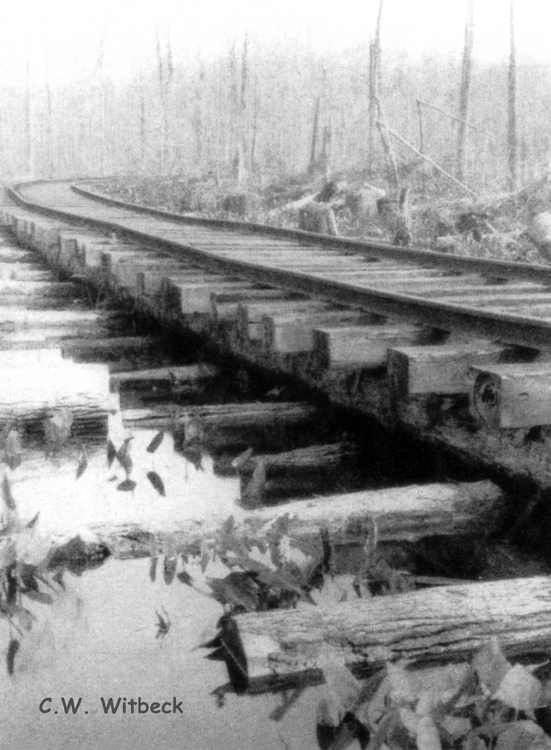 Another view of tracks being laid in the swamp. This machine made lifting and positioning of the heavy logs, ties and rails much easier. It appears to me that the inspiration for this equipment came from a McGiffert log loader.