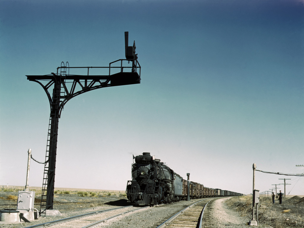 During his visit to New Mexico in March of 1943, Jack Delano captured this view of AT&SF locomotive #5000 heading up a westbound “extra” freight train. She sits in the siding at Ricardo, New Mexico with her train, waiting patiently for an opposing eastbound train. Note the crew members on the opposite side of the mainline. They will inspect the eastbound train as it passes. The engineer will do the same from the fireman’s perch up in the cab of the 5000.