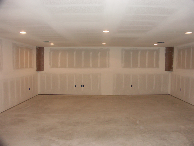 << Previous | The gypsum board (sheet rock) was hung the weekend before Thanksgiving, and the taping and floating was completed a week later. The dark rectangles in the corners are Masonite coves. The backdrop will be painted directly on the wall, and I hope the coves will soften the corners sufficiently. This is the view from the entrance. | Next >> |