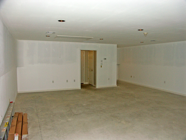 << Previous | And the final view after the priming and painting. The black line on the floor at left marks the edge of the future benchwork. I've still got to lay out the peninsulas. I'll then transfer key points to the ceiling using a plumb bob in order to position the light strips. | Next >> |