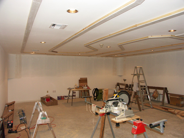 << Previous | Here's a shot of the 2x4 stripping that will be used to attach the valences and light strips. Notice how the supports are following the contour of the layout (you can take a look at the track plan elsewhere on this site to get a better idea of what it is you're looking at). To the left is the layout section running down the wall; to the right are the two peninsulas, and to the far right is another layout section running along the wall. | Next >> |