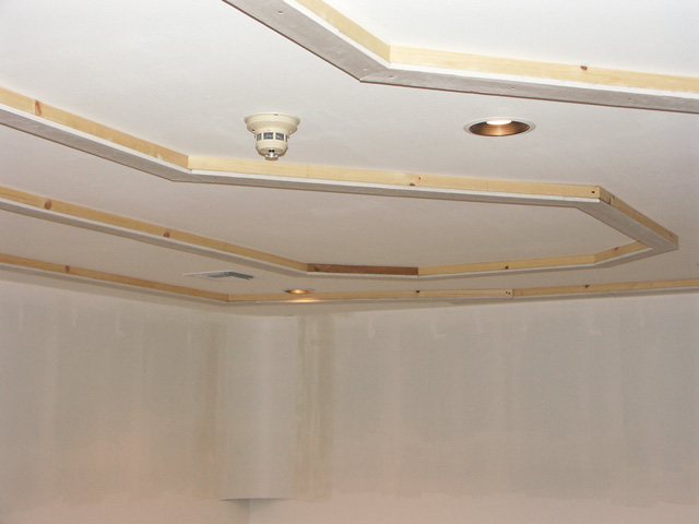 << Previous | The return loop of the stripping is over the orb at the end of a peninsula of the layout. The device in the center of the ceiling is a smoke detector. All the gypsum board that was used to cover the 2x4s came from scraps left over from covering the room. The building code requires that light fixtures not be in direct contact with combustible material (the wood), hence the layer of sheet rock. | Next >> |