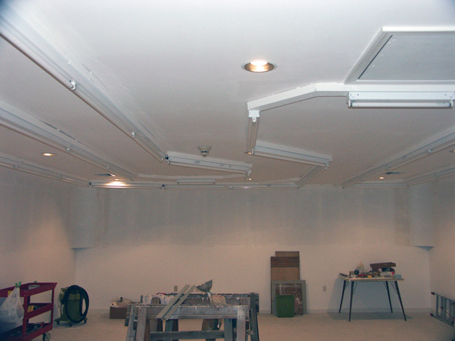 << Previous | This last photo shows the strip fluorescents off and the can lights on...quite a difference in lighting levels. Valences will be installed next. I will post additional photos once that is accomplished. There is a bit more paint trim to do, and the carpeting needs to be installed, but benchwork isn't that far off (finally!). | Next >> |