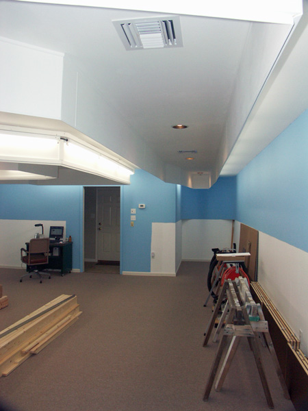 the lighting. This aisle will have the logging operation featured on both sides. The mill will be on the left in the peninsula, and the switchback climbing up into the woods will be at the right against the wall. |