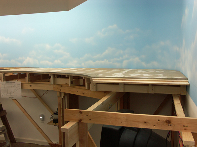 Here's the beginning of benchwork construction at the east end of Monterey. The main will be at the right, curving left into the yard. The yard will start at the left side of this view, and extend to the left. There will be a wye about center in the view, with it's tail track heading into the corner. | Next >> |