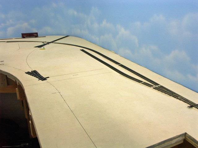 << Previous | We're back at the entry to Monterey and again I'm standing on a bench so we can look down on the trackplan. The mainline is at the far right and the spur is for the wholesale grocer. The tail track for the wye is installed and the curved switch which starts the yard lead is in. The track centerline coming from the uninstalled wye switch will lead to the Louisiana Central business office and freight house (to be located at the bottom of the photo). | Next >> |