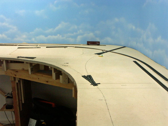 << Previous | Now panning to the left, we can better see the curved switch just past the crossing. The diverging route will lead into the passing/runaround track. The yard ladder starts at the switch just left of the curved one. It's obvious in this photo how the lift-up section is shaped to tuck in neatly with the track plan. The third (to be installed) wye switch is seen here. The interior of the wye will contain some MOW buildings and equipment. | Next >> |