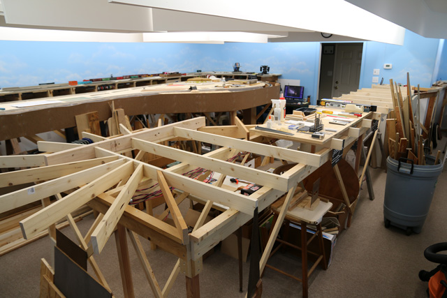 catch-all for tools and material during the construction. This is the fifth and final major area of benchwork to be addressed. The only remaining benchwork after this will be a short section across the room entry to the benchwork at top center. |