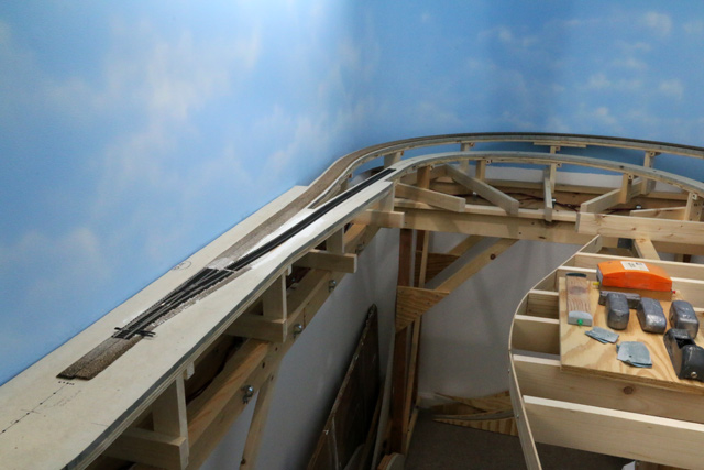 << Previous | The Louisiana Central and the Spencer trackage come out of their 180 degree curves in the alcove, then join here for a short run of joint trackage. Oneida is off to the left. The trackage here isn't installed yet; it's being cut and fitted. The line splits again as it enters Oneida. | Next >> |