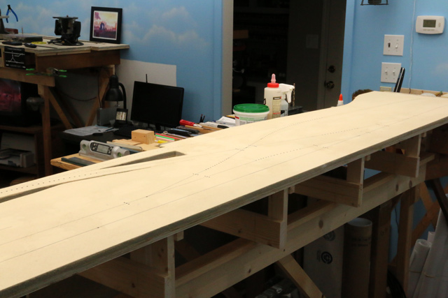 << Previous | Moving a bit to the left, there will be a small crude oil well and shipping point at the far left of the photo. The track (centerline) closest to the aisle is the Louisiana Central mainline. Next in is a passing siding. At center you can see where the spur to the sand and gravel pit will be. And if you look closely, you can see the Spencer trackage crossing that spur as it works it's way left toward the mill. | Next >> |