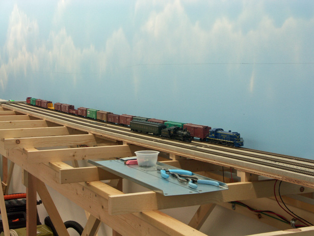<< Previous | This is the view from the opposite end of the staging tracks seen in the previous photo. The left and center tracks are the I.C. railroad, and the right track is for the Louisiana Central. This will be below the hills of the Spencer Lumber Company's logging operation. That faint line on the wall seen above the train is roughly at the roadbed height of the logging line. At the far left (near the aisle) will be the Louisiana Central mainline. | Next >> |