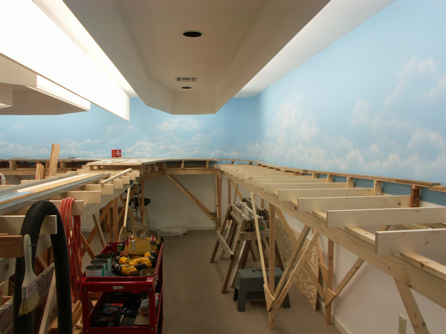 At the aisle's entry, we see the future Willis yard on the left, and the future Monterey yard to the right. The roadbed snaking along the wall is more hidden staging. The Illinois Central enters this staging down there at the far end. The Texas and Pacific will emerge from staging just about where the sub-roadbed ends at the far right of this photo. That track will come into the Louisiana Central yard and will represent the interchange with the T&P. | Next >> |